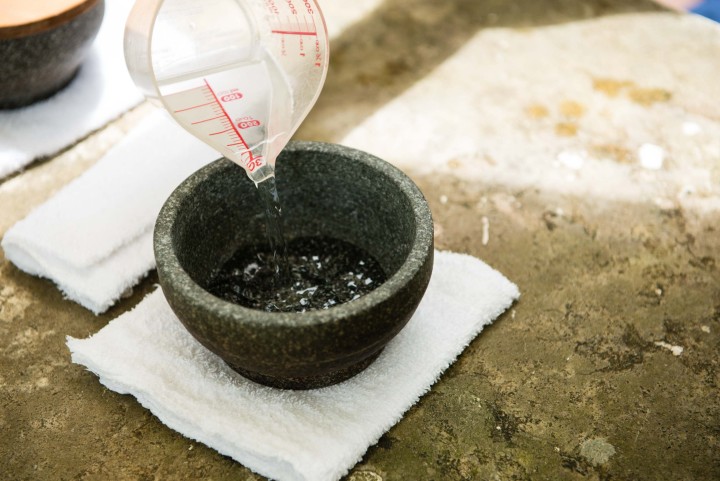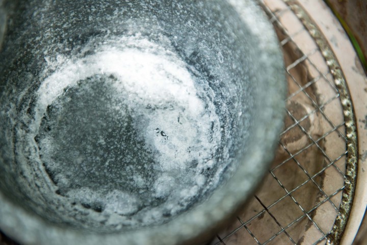 真正進入製鹽體驗後,首先是拿著寶特瓶到海邊汲取海水,接著燒炭火,在石鍋裡面慢慢熬煮海水,這時候工房的人會講解沖繩的鹽文化,旅客一邊持續攪拌約50分鐘。當鹽的結晶開始一點一點出現,這瞬間真是感動!