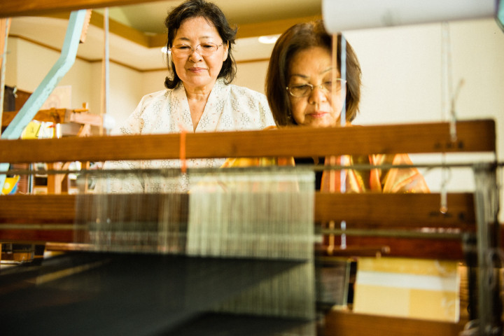 花織綿狹的設計、染色、編織等,所有步驟都是純手工作業,花費非常大的心力與時間,但是在「みね屋工房」的體驗課程當中,店家事先在紡織機上編織好直線,再讓客人體驗最後的穿橫線作業。